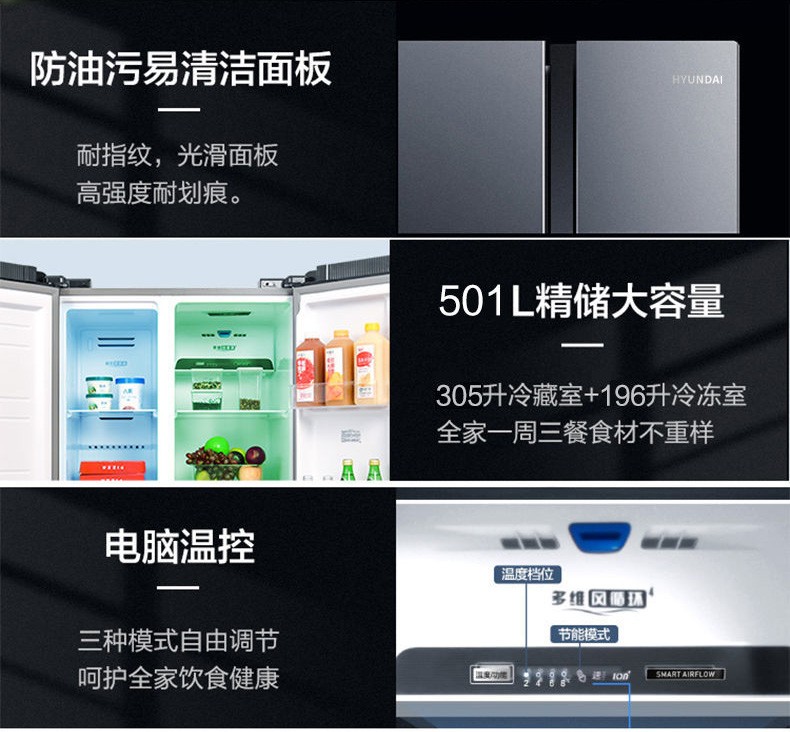 韩国(HYUNDAI)现代冰箱双开门 501升对开门家用电冰箱风冷无霜电脑温控大容量节能保鲜 501升