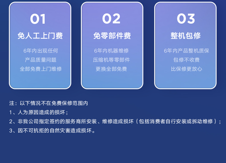 整机免费保修6年(含压缩机,电机,符合技术规范加长管,电控等所有空调部件),其他按照国家新三包规定办理