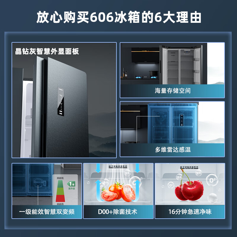 康佳(KONKA)606升智能双变频一级能效风冷无霜除菌净味超大容量对开双开门家用电冰箱BCD-606WEGQ5SP晶钻灰