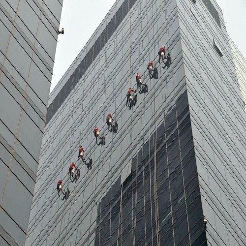 二、高空作业简介A、首先查看作业现场,确定作业方案。重点查看屋顶状况,确定能否安装吊篮、吊板,吊篮、吊板在屋顶移动有无障碍;霓虹灯、字牌有无防碍作业等。B、安装运载工具,如大厦已安装擦窗机,则按规范做操作前的检测。C、准备擦拭工具、清洗药剂。D、作业人员携带工具上吊篮或吊板,有些工具应拴在吊篮或吊板上,以防不小心失手落下,伤了行人。在地面设安全防护拦绳,或置安全警告牌。E、作业方式从上到下。每擦拭完一行,整理工具、加清洗剂、横向移动吊板或吊篮,再继续下一行作业。F、擦拭玻璃方法:1、检查玻璃上有无粘着物等污迹,如有,先用刮刀等相应辅助工具和溶剂除去。2、将涂水器浸入桶中,待充分吸入清洁剂后用手轻轻捋一下(以不往下滴水为宜),均匀涂在玻璃上。3、涂抹时,一般由上往下滚,横向移动,每趟滚迹要交叉相压,以防漏涂。4、用胶刮将玻璃上的清洁剂刮净,操作时应稍用力,将胶刮均匀按压在玻璃上,由上往下缓缓刮动,每刮完一行,用湿毛巾将胶刮擦拭干净再刮下一行。5、确认一次应作业范围内的墙面已清洗完毕,滑动吊篮或吊板继续往下作业。6、全部作业完成后,收拾整理设备和工具,撤离地面防护拦绳或警告牌,将地面水迹擦净。